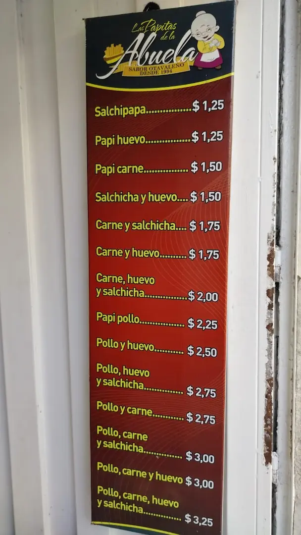 Las Papitas de la Abuela son una de esas huequitas tradicionales de Otavalo que han conquistado a generaciones enteras con su inconfundible sabor. Desde 1994, este lugar ha mantenido la misma receta que lo hizo famoso: papitas fritas crujientes y doradas, servidas con el acompañante que prefieras pollo, carne, huevo, salchicha o la opción completa, siempre generosas y con el auténtico gusto casero que tanto encanta.